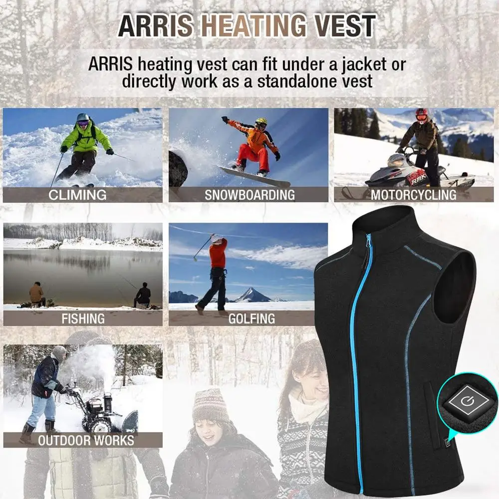 4.Adjustable Size: This rechargeable heated vest is designed to fit different body shapes and sizes. You can wear it under your jacket or coat or as a standalone vest. The vest is lightweight and easy to carry, perfect for outdoor activities such as skiing, hiking, camping, fishing, or working in cold weather.